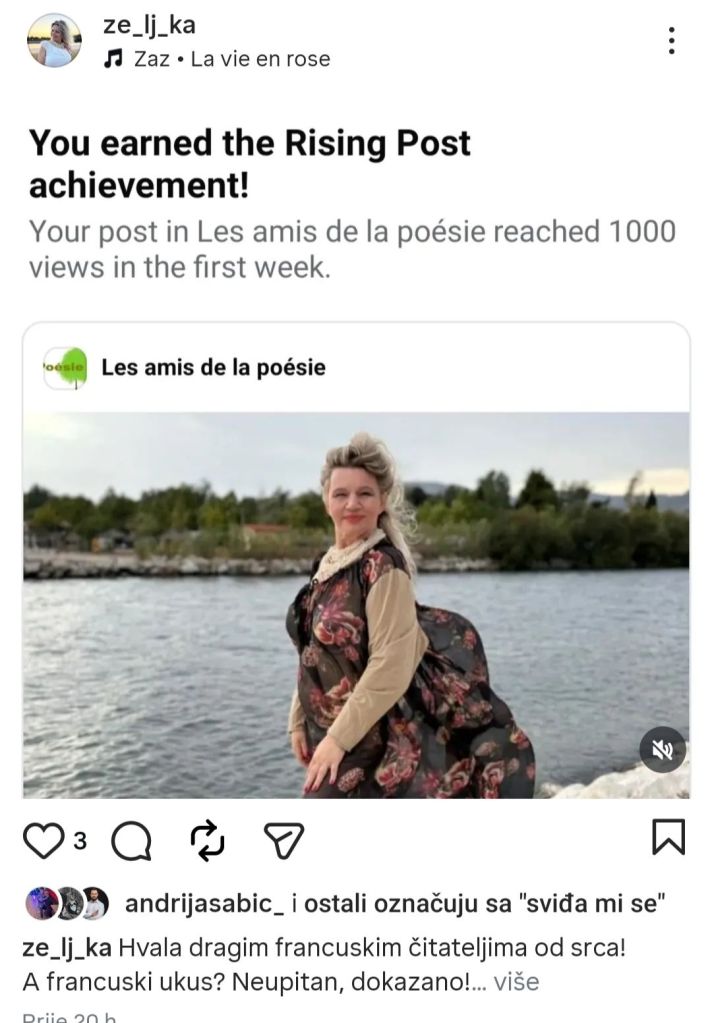 Hvala sad već mojim dragim francuskim čitateljima, osobno mi je zadovoljstvo i čast kad se moja pjesma prevede na francuski, to je moj jezik ljubavi u kojeg sam se zaljubila na prvo slušanje..